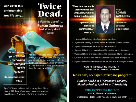 FLYER 062 Evangelist Testimony, Roman Gutierrez: TWICE DEAD **Purchase the BOOK on his life at: www.twicedeadministries.com